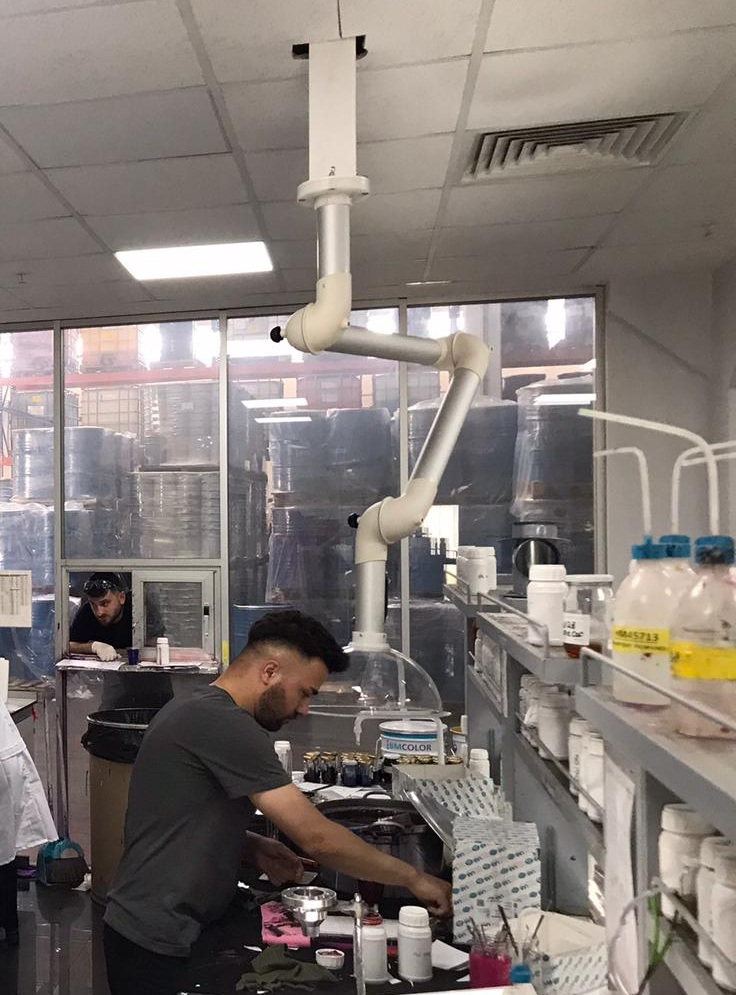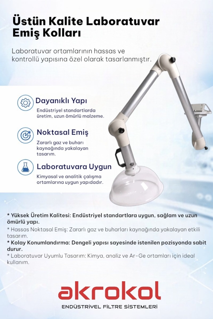 Laboratuvar emiş kolları, iki veya üç noktadan oynar mafsal yardımıyla istenilen pozisyona ayarlanabilir. Eloksal kaplı alüminyum boru ve polietilen mafsallardan imal edilmiştir. Kullanımı kolay ve hafif olup birçok alanda, özellikle hareket alanının kısıtlı, görselliğin de önemli olduğu alanlarda insan sağlığını korumaya yönelik iyi bir çözüm olmaktadır. İnsan sağlığına zararlı olabilecek kimyasalların solunmadan ortamdan uzaklaştırılmasını sağlar. Güvenilir ve sağlam, çok eksende hareket ettirilebilen lokal emiş koludur.
